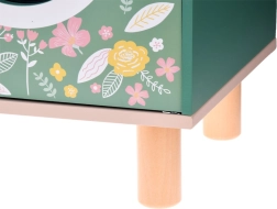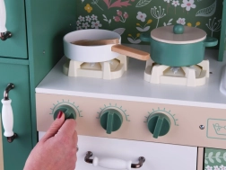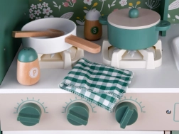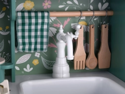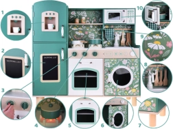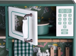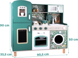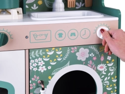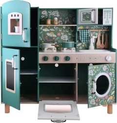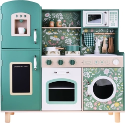 Velká dřevěná retro kuchyň pro děti je ideální hračkou pro rozvoj představivosti. Tento stylový kuchyňský set v zelené barvě s květinovým vzorem obsahuje spotřebiče jako lednici, trouba, mikrovlnnou troubu a pračku, umožňuje dětem vařit a organizovat hračková setkání.