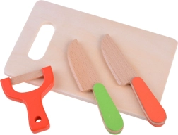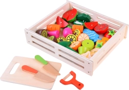 Obsah balení: Dřevěná bedýnka, deska na krájení, oboustranný nůž, obírač, různé druhy ovoce a zeleniny, jako je rajče, mrkev, okurka, papriky, jahody, kiwi a další.