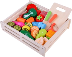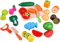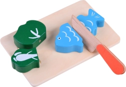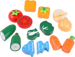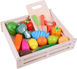 Tato dřevěná sada obsahuje pestrý výběr ovoce, zeleniny a ryby, vše vybavené magnety pro snadné rozdělování na části. Každý kus je vymodelován z kvalitního dřeva a malován netoxickými barvami, které zajišťují bezpečnost pro nejmenší.
