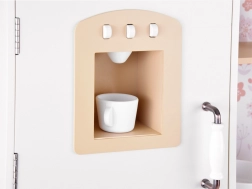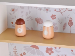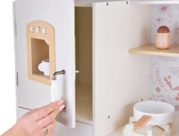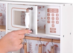 Výbava kuchyňky zahrnuje všechny potřebné doplňky k řízení domova, což umožňuje dětem učit se základní kuchyňské úkony hrou. Retro styl kuchyňky je zárukou elegance, doplněný béžovými prvky a květinovým vzorem na stěnách.