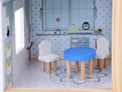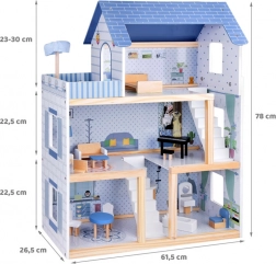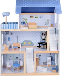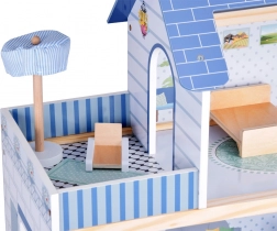 Součástí balení je bohaté příslušenství v kombinaci přírodního dřeva, bílé a odstínů modré. Reálné detaily, stabilní konstrukce a příjemná velikost místností podporují představivost, jemnou motoriku a samostatnou hru. Domeček skvěle vypadá zvenku díky okenicím a dekorativní střeše.