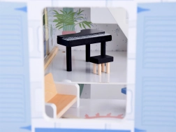 Komplet zahrnuje postel, sedací soupravu, lampu, piano, stůl a židle i koupelnové vybavení. Snadné aranžování a neomezené kombinace.