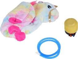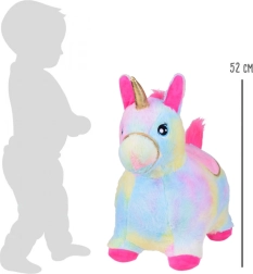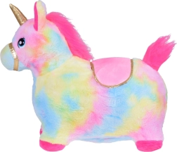 Tento skákací jednorožec spojuje odolné nafukovací tělo z gumy a hebký, příjemný plyšový potah v duhových barvách. Pečlivě zpracované detaily jako vyšité oči, zlatá uzda, měkké látkové sedlo se zlatou lemovkou a růžová hříva s ocasem si děti zamilují. Mezi ušima je ukrytá píšťalka, která každé hopsání ještě více zpestří.
