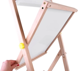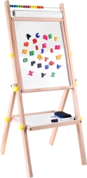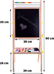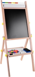 Dřevěná tabule s dvěma různými plochami pro kreslení a malování je ideální pro každé dítě. Obsahuje zásobník na příslušenství, počítadlo, roli papíru a magnetická písmena pro hodiny tvořivé zábavy.