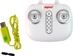V krabici najdete helikoptéru, dálkový ovladač SYMA, USB nabíjecí kabel, návod a náhradní malé vrtulky pro bezstarostný provoz.