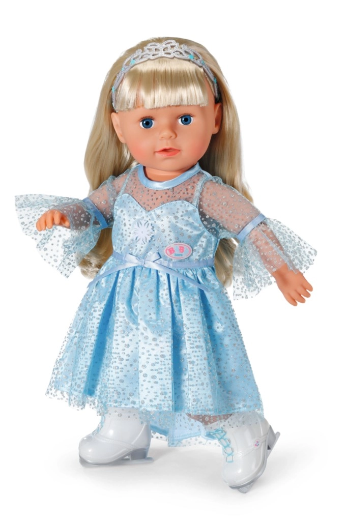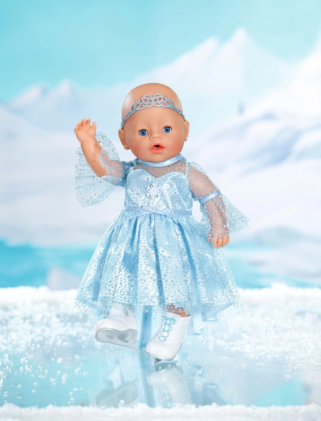 Elegantní set pro panenky BABY born 43 cm přináší kouzlo zimního království do každodenní hry. Lehoučké třpytivé šaty s jemným přehozem snadno obléknete a díky diadému bude účes držet i při každé piruetě. Bílé boty ve stylu bruslí podpoří fantazii a dětské příběhy o krasobruslení.