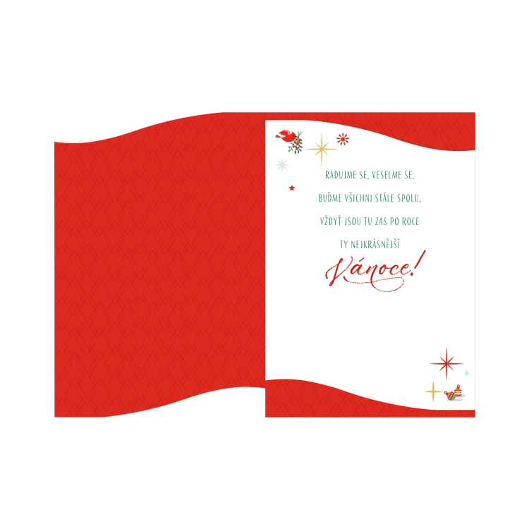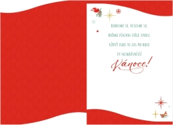 Text uvnitř: „Do tichého kraje zima tiše notuje, mráz v rytmu koledy obrázky do oken maluje. Veselé Vánoce.“