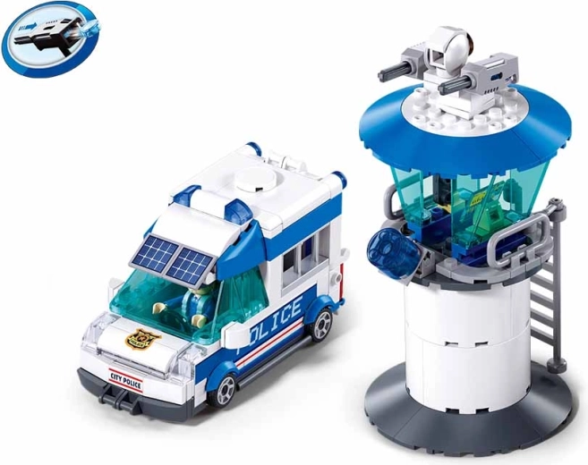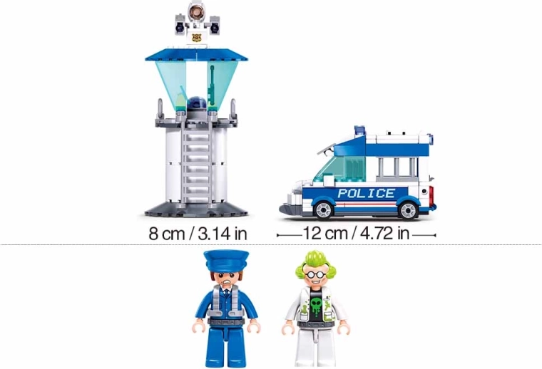 Stavebnice zahrnuje 245 precizních dílků, které lze poskládat do realistického policejního zázemí zahrnujícího auto a věž.