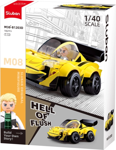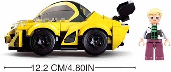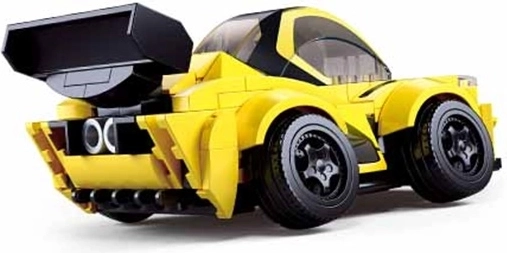 Stavebnice obsahuje model žlutého sportovního vozu s délkou 12,2 cm pro zábavnou závodní hru.