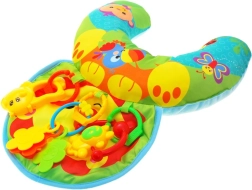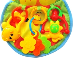 Barevná šustící mini podložka a odnímatelná chrastítka podporují rozvoj zraku, sluchu a jemné motoriky.