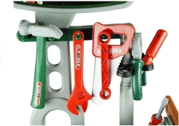 Dvoupatrový stůl s háčky, přihrádkami a boxem na šroubky udrží nástroje přehledně na dosah. Děti snadno napodobí skutečnou práci v dílně.