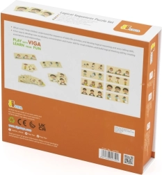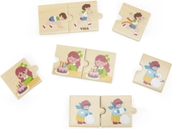 Tato dřevěná skládanka od firmy VIGA nabízí dítěti možnost sestavovat 8 barevných sad puzzle, které ilustrují různé činnosti dětí v jejich každodenním životě. Zahrnuje popularizované aktivity jako mytí rukou, běhání nebo sfoukávání svíček na dortu.