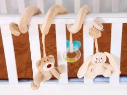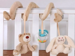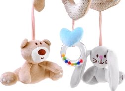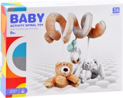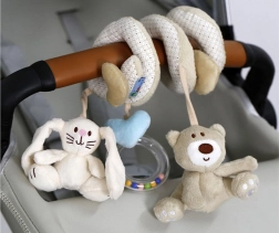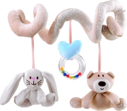 Plyšová spirála obsahuje tři závěsné hračky, které podporují rozvoj smyslů: medvídek, králíček a kroužek s korálky.