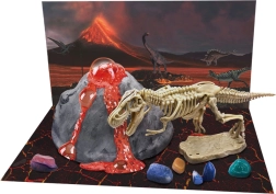 Součástí je odlévaný model vulkánu, směsi pro chemickou reakci (kyselina citronová a hydrogenuhličitan sodný), praktické nástroje pro kopání i čištění nálezů a ilustrovaný návod. V kráteru se odehraje realistická „lávová“ reakce a uvnitř modelu na děti čekají barevné minerály a kostra dinosaura k sestavení.