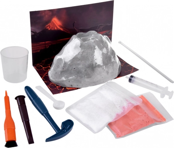odlitek vulkánu, sáček s kyselinou citronovou, sáček s hydrogenuhličitanem sodným, odměrka, stříkačka, míchátko, odměrný kelímek, kladívko, dlátko, štěteček, karton s ilustrací vulkánu, obrazový návod (popis v angličtině)