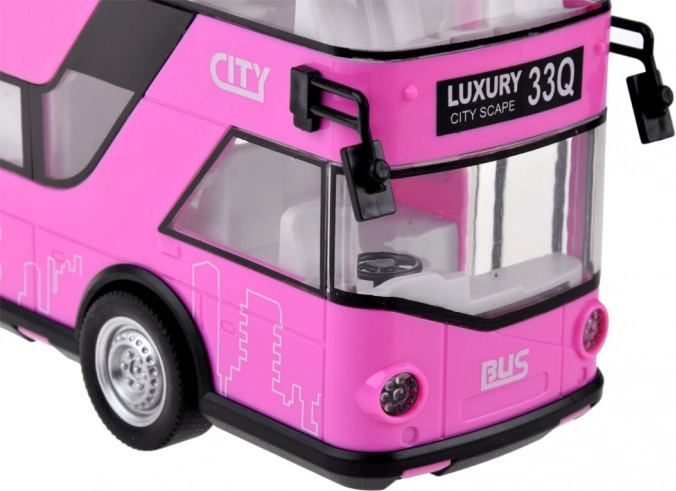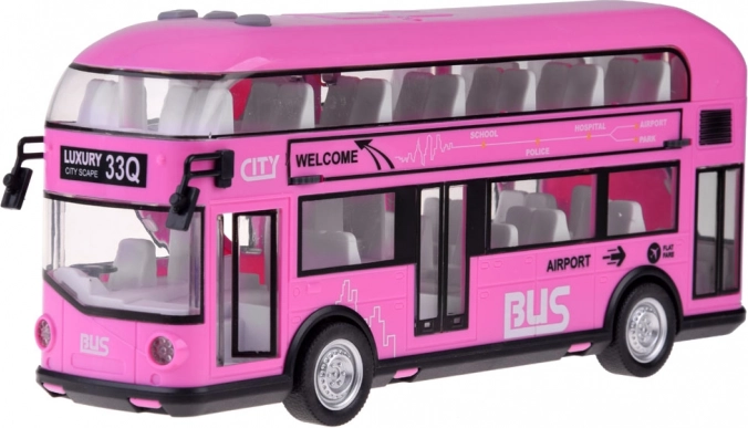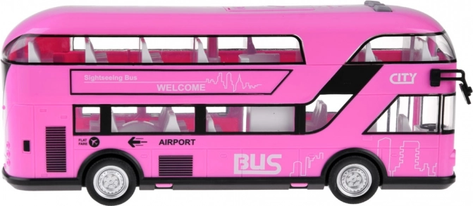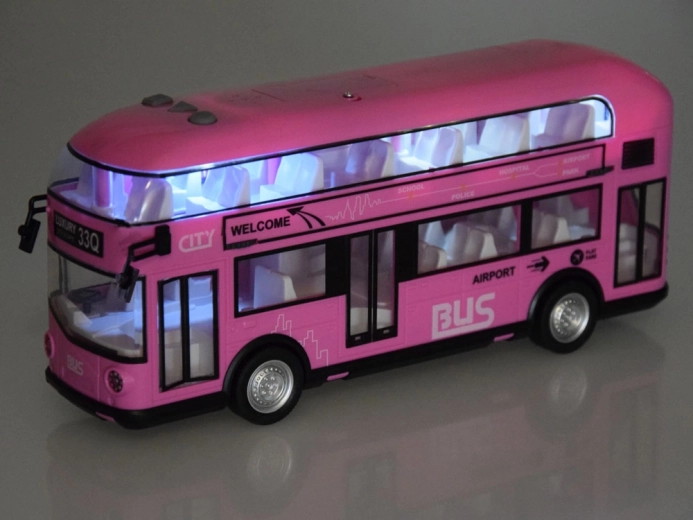 Zábavný růžový dvoupatrový autobus potěší každého malého řidiče. Nabízí otevírací dveře, světelné a zvukové efekty a pohyb na zpětný setrvačník – stačí autobus popotáhnout a rozjede se. Realistické detaily jako sedadla, volant a průhledná okna dělají hru ještě věrnější.