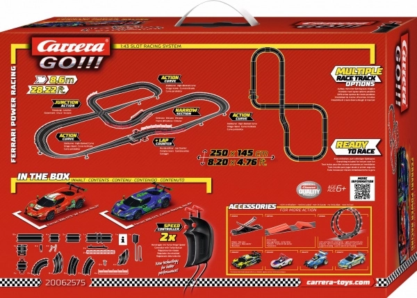 Zažijte napětí skutečných závodů s autodráhou CARRERA GO Ferrari Power Racing o délce 8,6 m. Set obsahuje dvě detailní auta FERRARI 296 GT3, křižovatku, klopené zatáčky, zúžení dráhy i počítadlo kol. Díky ovladačům s funkcí Turbo, magnetům a dvojitým kontaktním kartáčkům si užijete rychlou a plynulou jízdu s vysokou přilnavostí. Snadná montáž se systémem svorek a široké možnosti rozšíření zaručí nekonečnou zábavu pro děti od 6 let i dospělé.