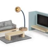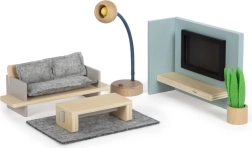 Tato krásně vypracovaná sada nábytku přináší do dětských her realistické prvky, které pomáhají rozvíjet fantazijní svět malých architektů a designérů. Děti mohou být zapojeny do hry díky schopnosti měnit „televizní program“ pomocí vkládacích karet, zatímco stojatý lampový sloup přidává skutečnou atmosféru obývacího pokoje.