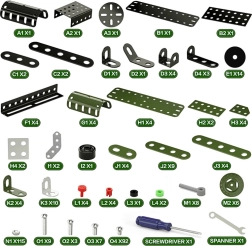 V balení najdete vše, co potřebujete k sestavení modelu včetně kovových a plastových dílků, nářadí, a nálepek.