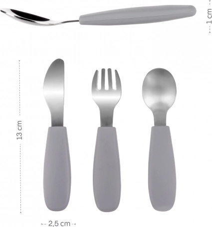 Dopřejte dětem radost ze samostatného jídla. Tento lehký a bezpečný příbor s protiskluzovými silikonovými rukojeťmi se skvěle drží v malých ručkách, přitom kovová část zajišťuje přesné nabírání a krájení. Skvělá volba pro první samostatné krůčky u stolu.