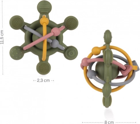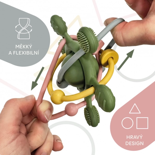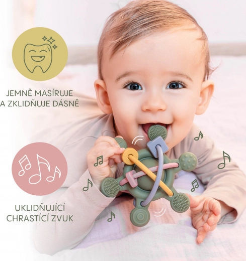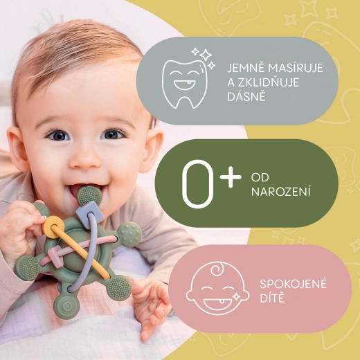 Měkké silikonové kousátko a chrastítko v jednom přináší miminkům úlevu při prořezávání zoubků a podporuje jejich rozvoj. Díky různým texturám, ergonomickému tvaru a lehké konstrukci je ideální pro malé ručičky. Vyrobeno ze 100% potravinářského silikonu, bez BPA, PVC a ftalátů – bezpečné, snadno omyvatelné a vhodné k sterilizaci.