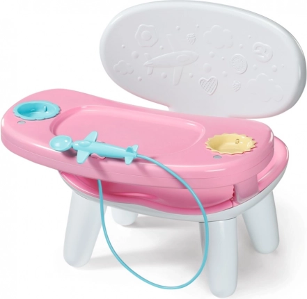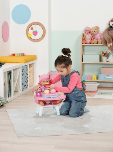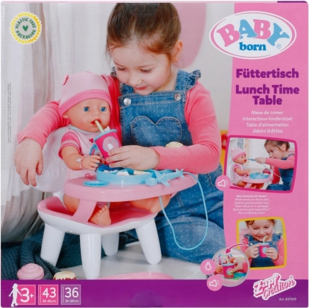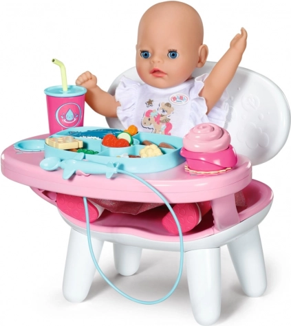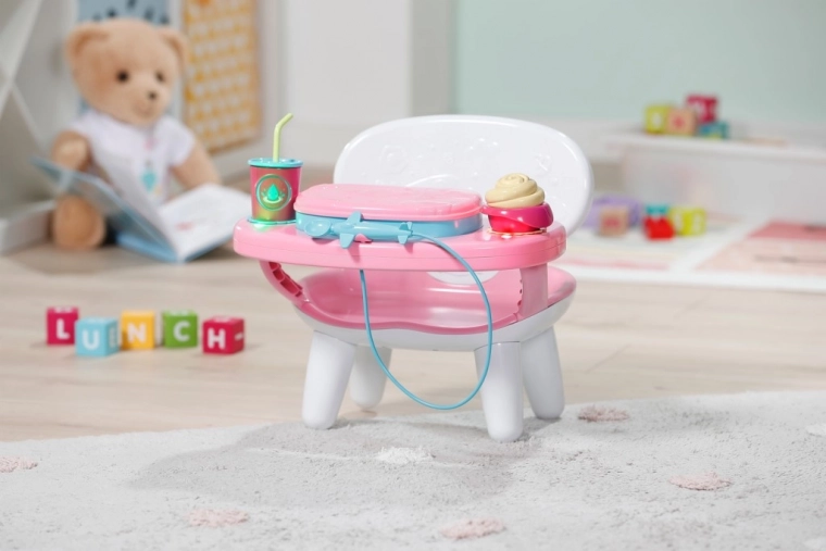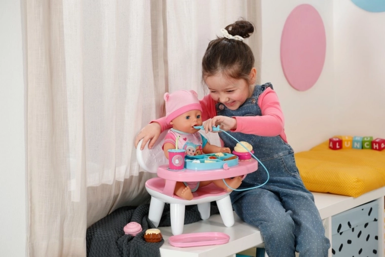 Interaktivní jídelní židlička BABY born promění každé krmení ve zábavnou hru. Když se rozsvítí zelené světlo, panenka „papá“ spokojeně, při červeném světle dává hlasitě najevo nesouhlas. Děti tak rozvíjejí empatii, jemnou motoriku i představivost během realistické péče o panenku.