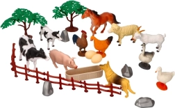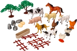 Set obsahuje plastová zvířata v různých velikostech, včetně krav, koní, ovcí, slepic, stromů a dalších doplňků jako plotů, kamenů a vajec, které zajišťují vzdělávací a kreativní rozvoj.