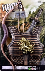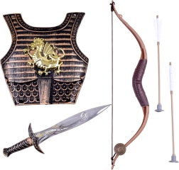 Set obsahuje zbroj, luk, dva šípy a meč – ideální kombinace pro fantazijní bitvy i karnevalové kostýmy.