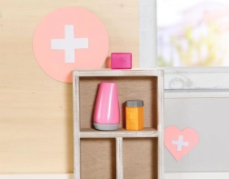 Sada obsahuje růžové lékařské pomůcky jako jsou nůžky a rouška, které jsou ideální pro hru na doktora.