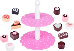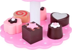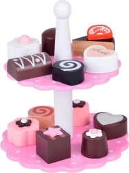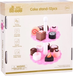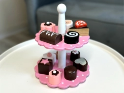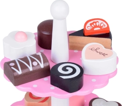 Obsahuje různé dřevěné zákusky a dvoupatrový stojan v jemných pastelových barvách, které připomínají svět sladkostí. Díky této sadě se každá hra stane báječným, chutným dobrodružstvím.