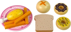 Součástí je talíř a výběr potravin: donutky, pečivo, hranolky i kuřecí palička – ideální pro servírování a hraní na kuchaře.