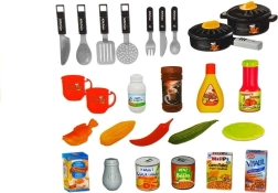Součástí balení je bohatá sada doplňků: nádobí, příbory, potraviny i náčiní pro všestrannou hru. Kuchyňka podporuje rolové hry, rozvoj slovní zásoby a společné hraní dětí.
