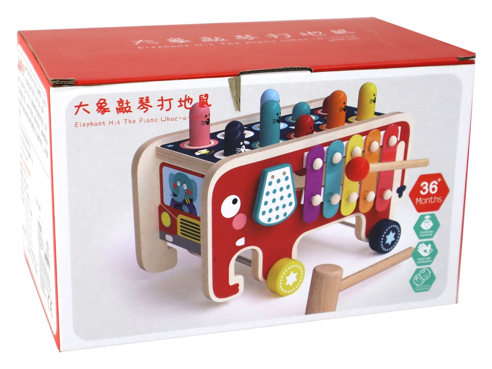 Dřevěná hra Whac‑a‑Mole ve veselém designu slona kombinuje oblíbené „ťukání do krtků“ s funkcí tahací hračky. Děti pomocí kladívek trefují barevné kolíčky, otáčejí ozubenými kolečky na boku a mohou slona tahat za šňůrku po pokoji. Pevná dřevěná konstrukce a hladké hrany zajišťují bezpečné hraní.