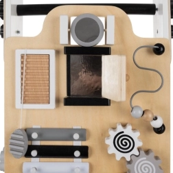 Přední panel tvoří multifunkční manipulační centrum: cimbálky s paličkou, počítadlo, ozubená kolečka, labyrint se slidingovými prvky, korálky, otevírací dvířka a třídění tvarů. Každá strana přináší jiný typ hry – děti si tak procvičí jemnou motoriku, logické myšlení, koordinaci oko–ruka i smyslové vnímání.
