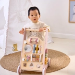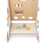 Chodítko obsahuje zrcadlo, otáčecí kostky a další aktivity, které podporují motorické a kognitivní dovednosti.