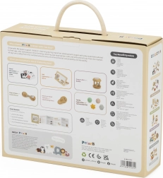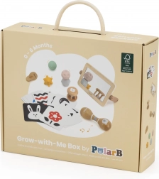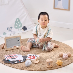 Tato pečlivě sestavená sada podporuje přirozený vývoj miminka od prvních dnů. Vysokokontrastní karty trénují fixaci pohledu a vnímání tvarů, dřevěné zrcátko pomáhá se sebeobjevováním a „tummy time“, chrastítka a maracas rozvíjejí rytmus, sluch a koordinaci. Různé textury a tvary hmatových míčků stimulují jemnou i hrubou motoriku a posilují úchop.