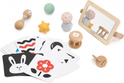 - V balení najdete: kontrastní karty, dřevěné zrcátko, rolovací chrastítko, překládací disk, dvojitý maracas a sadu hmatových míčků