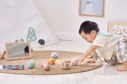 Odolné zrcátko s dřevěným rámem pomáhá při „tummy time“, podporuje zvedání hlavičky, posiluje šíji a přináší první kontakt s vlastním odrazem. Skvělé pro rozvoj sebeuvědomění a sociálních dovedností.