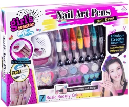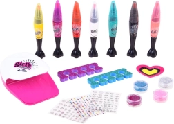 Kreativní sada na manikúru a pedikúru pro děti přináší vše, co je potřeba pro originální nehtové zdobení: 7 barevných fixů/laků s přesným hrotem i štětečkem, třpytky, samolepky, separátory prstů a praktický mini vysoušeč na baterie. Skvělá zábava pro domácí SPA i setkání s kamarádkami.