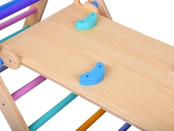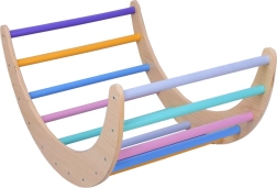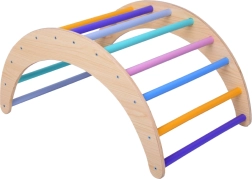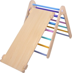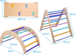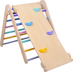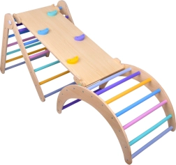Tento dřevěný domácí set 3v1 nabízí nekonečné možnosti kombinací pro lezení, klouzání i houpání. Trojúhelník, oblouk a oboustranná rampa lze používat samostatně nebo propojit do zábavných dráh. Díky pečlivě zabroušeným hranám a odolným spojům je hra bezpečná a plynulá, přičemž pastelové příčky motivují děti k přirozenému pohybu.