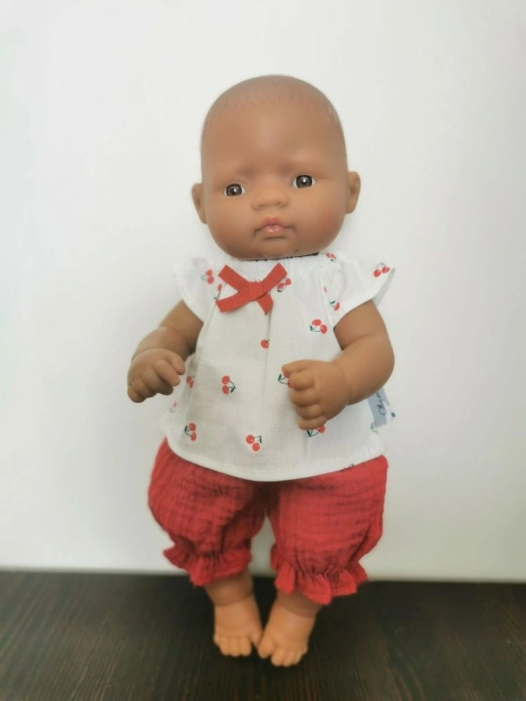 Roztomilá mušelínová sada pro panenky o velikosti 32 cm s jemným vzorem třešniček. Vyrobeno v Polsku z příjemného a vzdušného materiálu, který je šetrný k dětské pokožce. Lze snadno udržovat a žehlit na nízkou teplotu, ideálně použít páru pro zachování struktury mušelínu. Vhodné pro děti od 3 let a splňuje CE normy.
