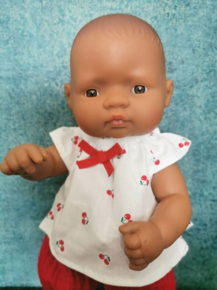 Tato sada je ideální jako dárek i pro rozšíření výbavy panenek. Nadčasový vzor třešniček a příjemný materiál podpoří kreativní hru a péči o panenky.