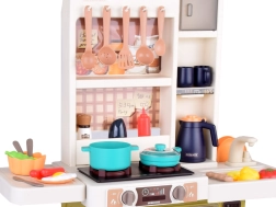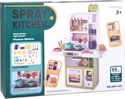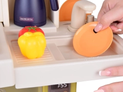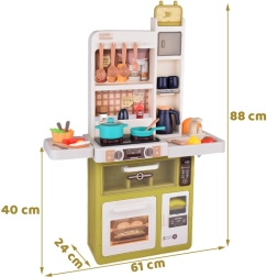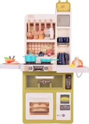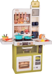Interaktivní dětská kuchyňka v krémově zeleném provedení promění hru na vaření v realistický zážitek: nabízí tekoucí vodu, světelné a zvukové efekty, vytváření páry a 55 dílů příslušenství. S otevírací lednicí, troubou a myčkou a rozměry 88×61×24 cm rozvíjí kreativitu, motoriku i sociální dovednosti.