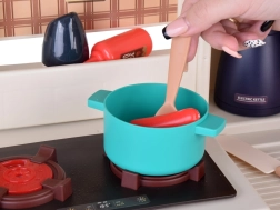 - Hrnec s poklicí, rendlík, konvice, talířky, šálky, příbory, naběračka, cedník, špachtle, lžíce na těstoviny, kořenky, kečup; potraviny (rajče, paprika, hrášek, banán, kreveta, vejce, klobásky)