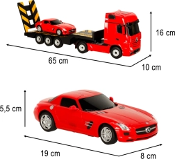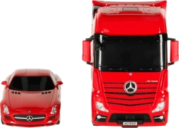 V balení získáte přepravní kamion MERCEDES-BENZ Actros a sportovní MERCEDES-BENZ SLS AMG – ideální kombinace pro realistickou hru s nakládkou a přepravou.