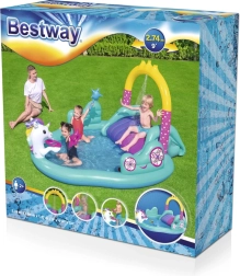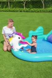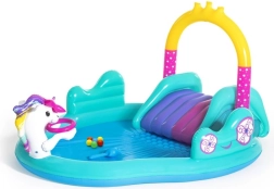 Proměňte zahradu v vodní centrum zábavy pro děti! Nafukovací hřiště s motivem jednorožce nabízí bazén s kapacitou 220 l, šplouchací obloukový sprchovač po připojení hadice a širokou skluzavku pro dvojitou porci radosti. Odolný PVC materiál, pohodlné rychlovypouštění a bohaté příslušenství zajistí dlouhé hodiny bezpečné zábavy.