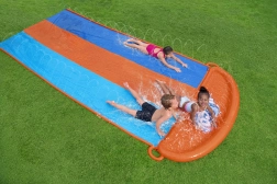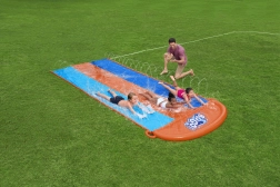 Uspořádejte domácí vodní závody přímo na zahradě. Trojitý skluz BESTWAY nabízí tři paralelní dráhy, díky nimž mohou děti soutěžit bok po boku. Postranní sprchovače vytvářejí jemnou vodní kaskádu a udržují povrch perfektně mokrý pro rychlý a plynulý skluz.