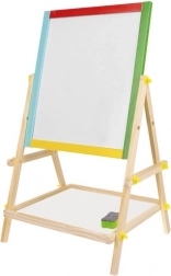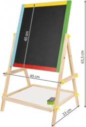 Stabilní dřevěná konstrukce s barevnými prvky je odolná a bezpečná pro děti. Praktická police na příslušenství udrží křídy, popisovač i houbičku vždy po ruce. Snadná montáž bez speciálního nářadí potěší každého rodiče a kompaktní rozměry se hodí do dětského pokoje i herny.
