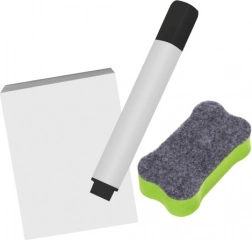 Součástí je police na uložení pomůcek a startovací set: barevné křídy, popisovač a houbička pro okamžité použití.
