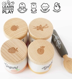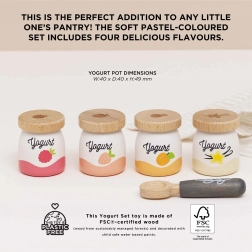 Začněte den se sadou dřevěných jogurtů od Le Toy Van! Obsahuje čtyři přívětivé makety jogurtů s příchutěmi broskve, vanilky, maliny a jahody. Dřevěné dílky podporují rozvoj jemné motoriky a umožňují dětem prozkoumávat důležitost zdravé výživy.